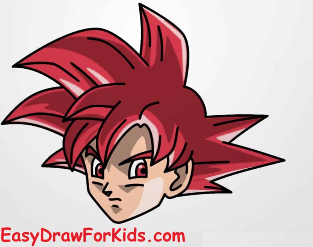Step 9: Color the hair dark red for Super Saiyan God form. Fill in the eyes, skin, and shadows.